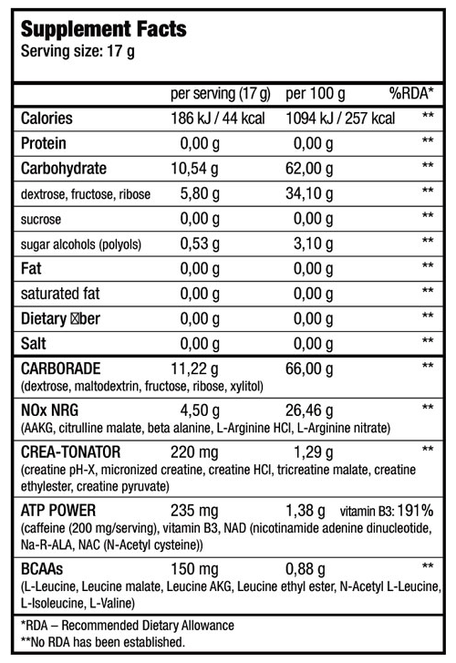 Предтренировочный комплекс для бодибилдинга в форме ароматизированного порошковой смеси. Добавка содержит стимуляторы, позволяющие ощутимо повысить физическую трудоспособность, поднять силовые показатели, выносливость, получить мощный пампинг, отдалить порог усталости, и в тоже время, уберечь мышцы от лишнего изнашивания и травматизации во время тренировки.