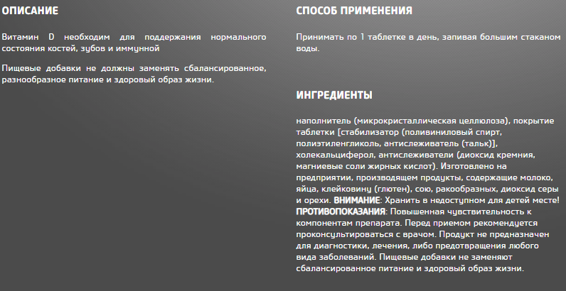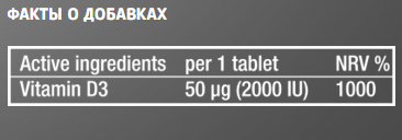 Состав порции (1 капсула): Витамин D3 - 50 мкг. Ингредиенты: (микрокристаллическая целлюлоза), мальтодекстрин, противослеживающий агент (тальк), желатин, сахароза, кукурузный крахмал, частично гидрированное соевое масло, холекальциферол.