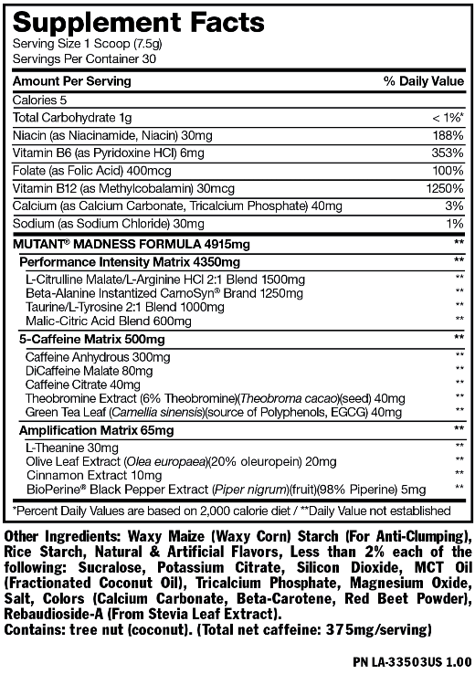 MUTANT MADNESS - це предтренировочний стимулятор, який переведе вас на інший рівень. Він створений з єдиною метою - збільшити інтенсивність і безкомпромісність тренувань. Приготуйтеся до екстремальної потужності, силі і нового рівня продуктивності. Продукт включає концентровану суміш найбільш ефективних інгредієнтів в науково обґрунтованих, ефективних дозах. Ця формула преміум-класу представляє собою суміш креатину, аргініну, цитруллина і бета-аланіну, що дає прилив енергії і забезпечує витривалість під час тренування. Крім того, продукт містить до 335 мг кофеїну з п'яти різних джерел і володіє феноменальним смаком.