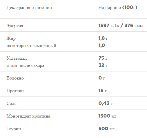 Комплексная смесь правильно подобранных углеводов с различными гликемическими индексами и комплекса белков, способствующих росту и поддержанию мышечной массы, обогащенная тщательно подобранными порциями моногидрата креатина и таурина. Потребление креатина способствует увеличению физических возможностей во время коротких повторяющихся упражнений высокой интенсивности (при дозировке 3 г в день).
