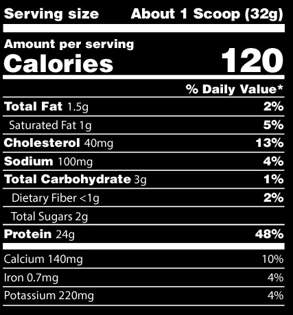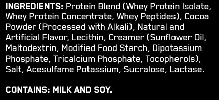 Ингредиенты: протеиновая смесь (изолят сывороточного протеина, концентрат сывороточного протеина, сывороточные пептиды), искусственные ароматизаторы, лецитин, ацесульфам калия.