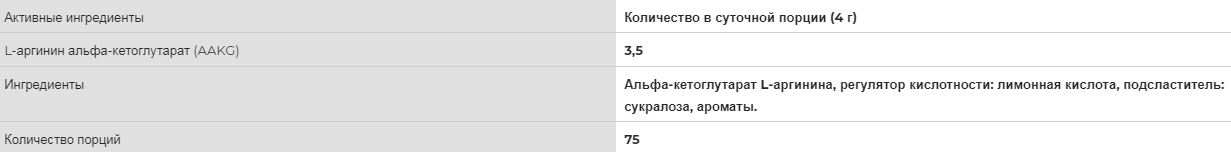 Ингредиенты: аргинин альфа-кетоглутарат (AAKG), ароматизаторы, диоксид кремния, сукралоза, краситель.