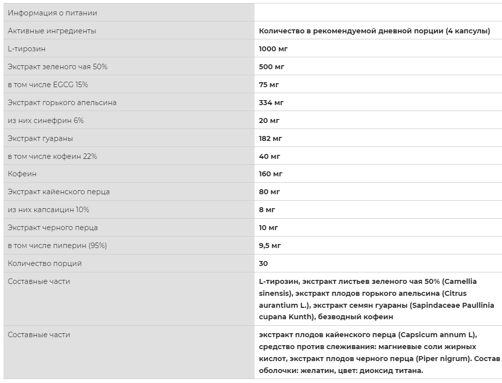 Продукт также содержит экстракт горького апельсина , который является источником синефрина - ингредиента, который усиливает термогенез (повышение температуры тела) и создает подходящую среду для «сжигания» накопленного избыточного жира. Экстракты черного и кайенского перца являются источниками капсаицина и пиперина , которые способствуют усилению потоотделения . Присутствие экстракта зеленого чая помогает с антиоксидантным действием и нейтрализует свободные радикалы кислорода .